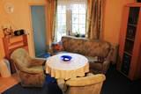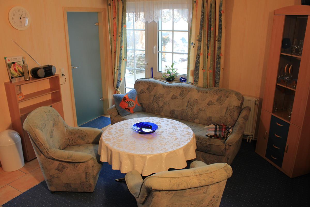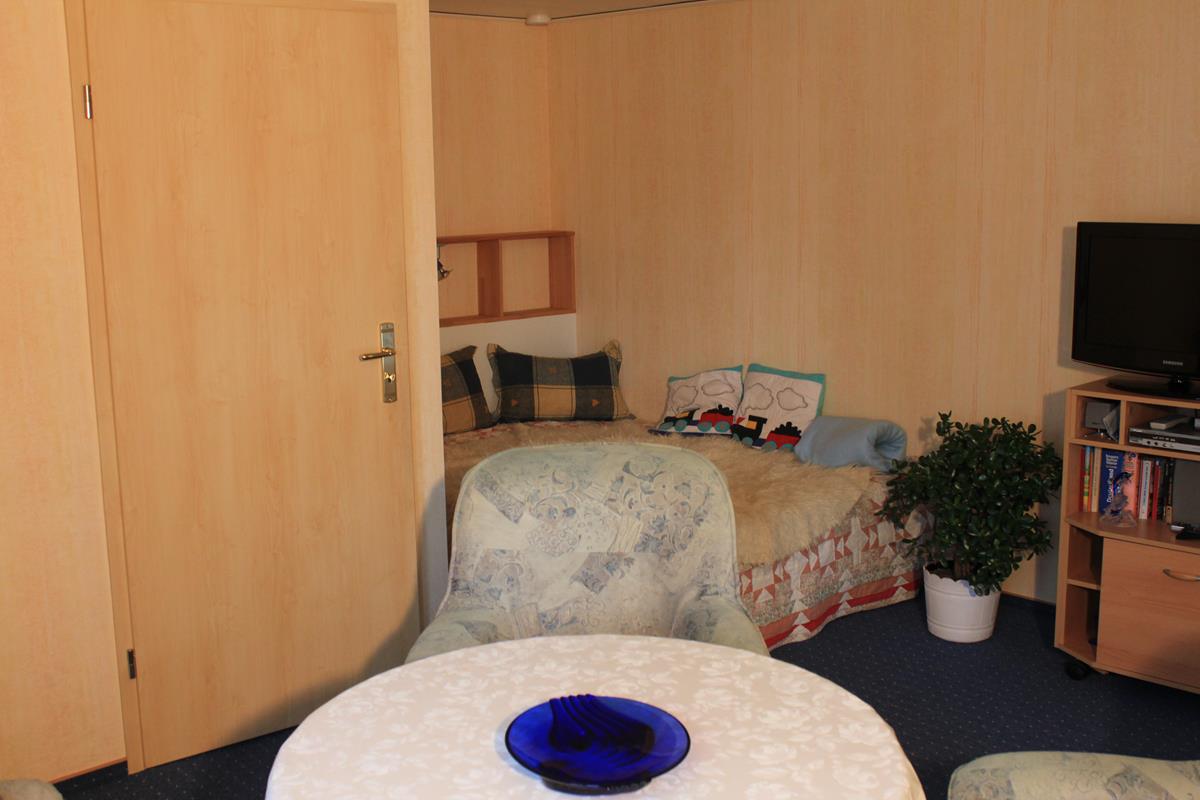 - Wohnzimmer: Couch, Tisch, 2 Sessel, Doppelliege 1,40 m, Flat TV, Bücher und Spiele